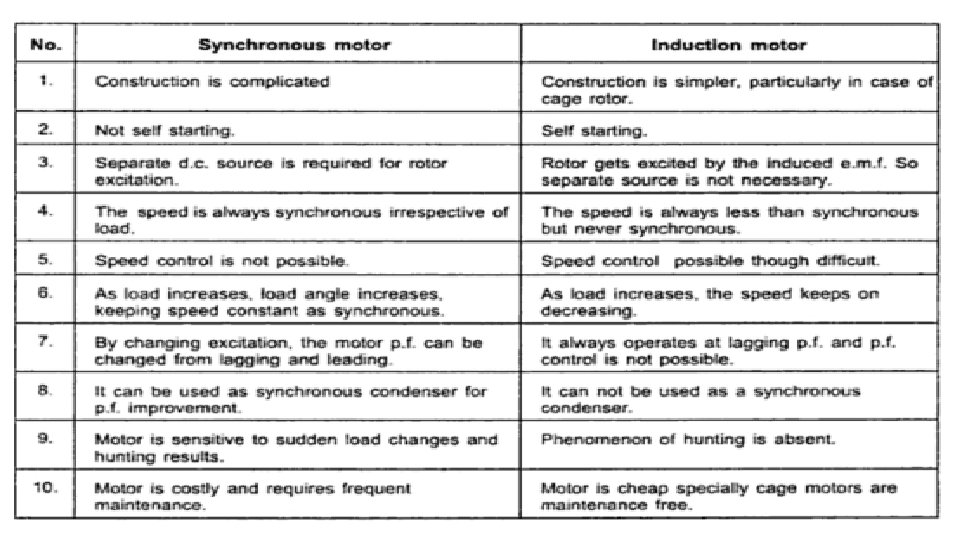 Types of AC Motor: : : [depending on the type of rotor used] o The first type is the induction motor or asynchronous motor: This type relies on a small difference in speed between the rotating magnetic field and the rotor to induce rotor current. o The second type is the synchronous motor: This type does not rely on induction and as a result can rotate exactly at the supply frequency or a sub-multiple of the supply frequency.