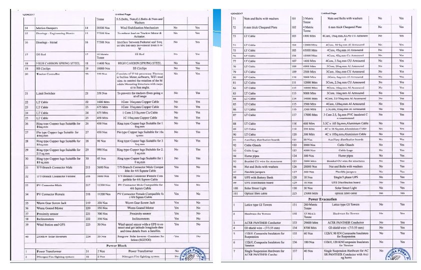 Items Required for Initial Setting up of Solar PV Power Project Sr. No. Block 1 Solar Block 2 Power Block 3 Power Evacuation Block 4 Measuring Instruments Description of Items Solar Module, String Monitoring Box, DC Cables, MC 4 Connectors, Branch Connectors, Module Mounting Structure, Conduit/Hume Pipes, Solar module tracker bearing Mechanism Inverter, Transformer, HT Cable, LT Cable, Isolators, Ring Main Unit, AC/DC Distribution Board, VCB/SF 6 Circuit Breaker/MCB, HT Panel, Battery and Battery Charger, DO Fuse, Discharge Rod ACSR Conductor, Vibration Damper, Repair sleeve, Disc/Pin Insulator, Switchgear, Control and Relay Panel, 2/4 -Pole structure, Surge Arrester SCADA System, ABT Meter, Metering CT/PT, Weather Monitoring Device, RS 485 Communication Cable, Fibre Optic Cable, Pyranometer, Anemometer, Module Temperature Sensor, Ambient Temperature Sensor