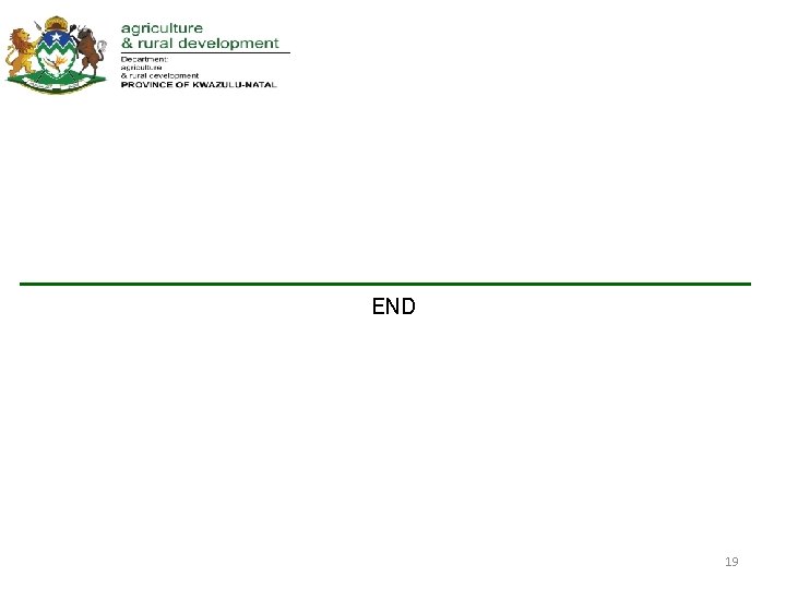 State of readiness Fetsa Tlala • Picture of Maize and Beans show that the province has started planting under irrigation areas. • Currently planted 45 ha of Maize and 30 ha of Beans. 18