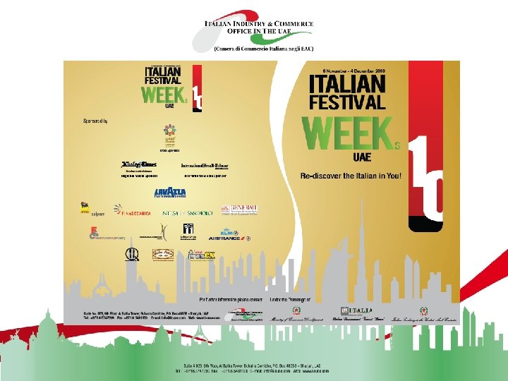 PRESENTAZIONE DELLA CAMERA DI COMMERCIO ITALIANA NEGLI EAU L’attivita’ della IICUAE inizia a Sharjah nel 1999 grazie ad un progetto della CNA Torino finanziato da Regione Piemonte ed ICE. Nel 2002 IICUAE estende la propria competenza su tutto il territorio nazionale e dal 2004 anche la Confartigianato entra nel Consiglio di Amministrazione. Nel 2006 IICUAE inizia il processo di riconoscimento da parte del Governo Italiano come Camera di Commercio Italiana all’estero, che termina il 17 Novembre 2009. Tra le iniziative di maggior prestigio della Camera si segnala l’ideazione di “Italian Lifestyle in the Emirates”, l’unica Fiera italiana nei Paesi del Golfo (Sharjah, 2004 -2007) e l’Italian Festival Weeks in the UAE, giunta alla quinta edizione, un calendario di attività culturali ed economiche si svolge nei tre principali Emirati di Abu Dhabi, Dubai e Sharjah. Dal 15 giugno 2010, la Camera ospita ufficialmente l’ENIT nel Paese. Alla fine del 2010 la Camera ha aperto un Desk Qatar ed ha in programma l’apertura di un desk nella capitale del Paese, Abu Dhabi.
