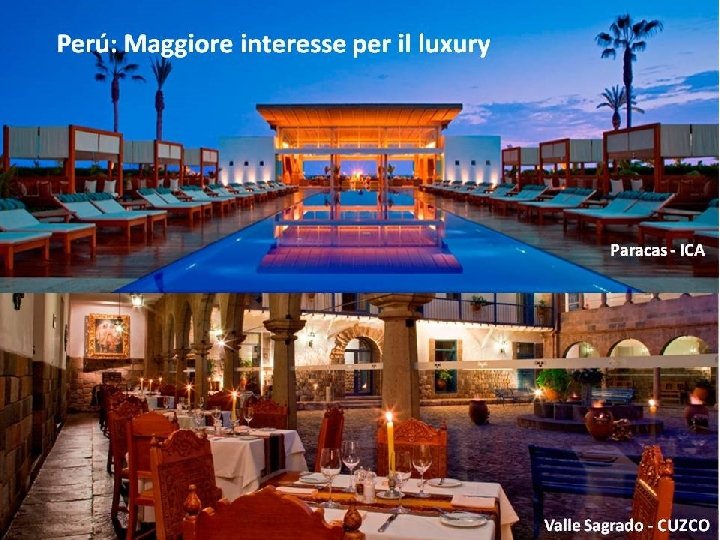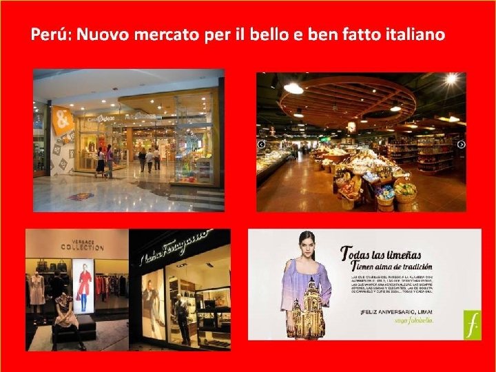Agroalimentare Potenziale agroindustriale. Ottime opportunità per le aziende italiane che offrono tecnologia, packaging, imballaggio e know-how. Sviluppo del biotrade. Implementazione di certificazioni di qualità. Denominazioni d’origine, ecolabel, ecc. Tessile e abbigliamento Ottime materie prime: cotone e primo produttore di fibre pregiate come alpaca e vigogna. Ottime opportunità per le aziende italiane che offrono tecnologia (macchinarie) e design.