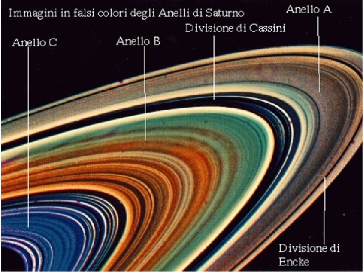 DIVISIONE DEGLI ANELLI Gli anelli visibili vengono indicati con lettere maiuscole: i principali (osservabili anche da Terra) sono gli anelli A (il più esterno) B e C che presentano delle divisioni nette determinate dall'interazione gravitazionale con i satelliti del sistema di Saturno. Tra gli anelli A e B (che sono i più brillanti) esiste la divisione di Cassini dal nome del suo scopritore. La suddivisione nell'anello A, molto più debole è nota come divisione di Encke. L'anello C è semitrasparente ed è chiamato anche "anello scuro". Gli altri anelli sono stati scoperti grazie alle sonde spaziali; cioè dalle sonde Voyager 1 e 2. L'anello D è interno (prima dell'anello A) mentre gli anelli E, F e G sono tutti più esterni rispetto all'anello A.