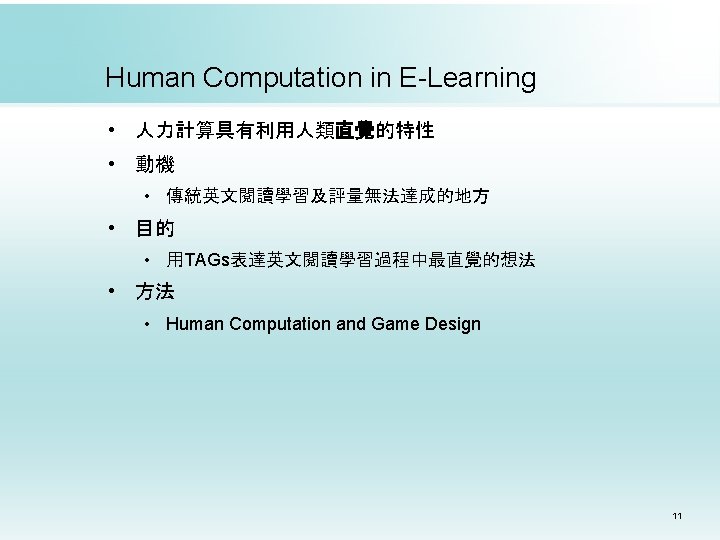 Human Computation System - re. CAPTCHA • Proposed by Ahn (2008) • Gathering the characters that optical character recognition (OCR) software has been unable to read 10