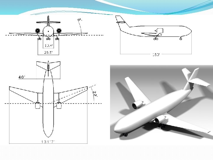 Location of center of gravity �Four fuel tanks �C. G. shift during flight �Depends on fuel tanks position. Location of C. G. Most forward Most aft 64. 6 ft 63. 7 ft 65. 5 ft * From nose