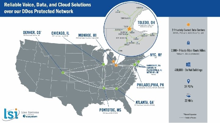 Welcome to Line Systems, a Division of Telesystem 23 – Number of years in business operation (1994) Product Portfolio – National Voice, Data, Cloud; Regionalized Private Fiber 21, 000+ – Number of combined Telesystem/LSI customer locations 40 – Number of states that Telesystem/LSI has customers 5 – Number of International destinations (Canada, England, Israel, Singapore, Costa Rica) Part of the Block Communications family of media companies • MSOs in Mississippi, Alabama, and Ohio • National CLEC: Includes legacy Telesystem (Midwest, midsouth) and LSI acquisition (mid Atlantic, southeast, northeast) • Network Television Affiliates in Idaho, Illinois, Ohio, and Kentucky • Newspapers- Toledo Blade and Pittsburgh Post Gazette