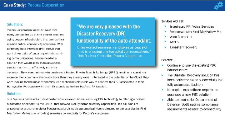Virtual Auto Attendant • Cloud Based Auto Attendant for Disaster Recovery/Business Continuity • Calls to LSI/Telesystem PRI automatically redirected to AA • AA has directory, voicemail, find me/follow me • $50. 00 per account (MRC) • $1. 00 per DID for Comm. Portal Access (MRC) • Can be utilized by a non-LSI customer for DR purposes and network diversity