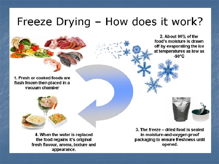 Freezing and Freeze-Drying n n Freezing- preserves foods by slowing the action of the enzyme rather then destroying them. Microorganisms are not killed, only inactive till thawed.