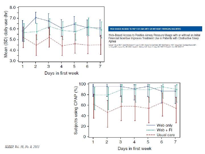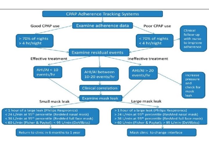 CPAP adherence • A team effort is needed to enhance CPAP adherence. The team may consist of the patient , family/bed partner, medical-equipment provider, respiratory therapist, sleep center staff, sleep center physician, primary care physician, and a home nursing service if applicable. • Adherence is dependent on layers of information providing the patient with ongoing education, written instructions, demonstration of equipment, and the timely addressing and troubleshooting of the patient’s concerns and problems. • Adherence of patients are clear indicators of the quality of the service.