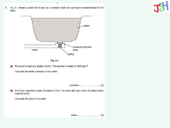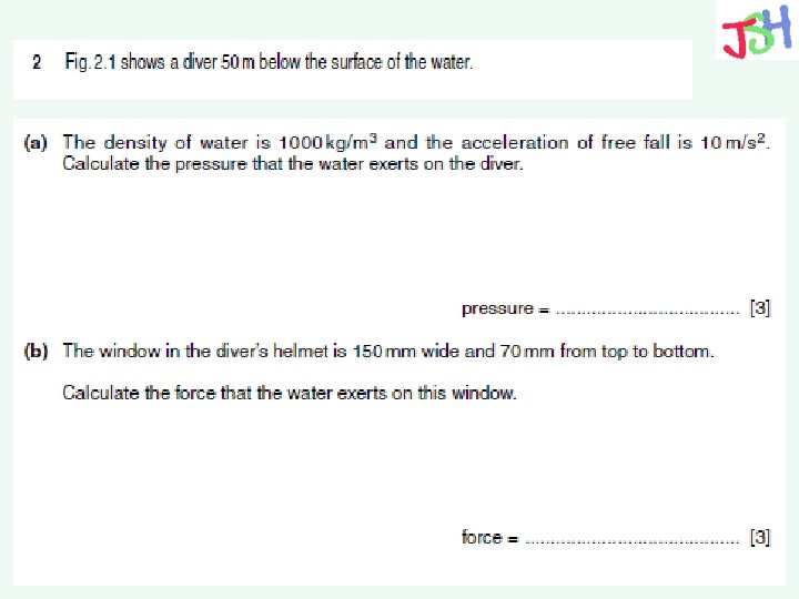 Diver question Example (a)Calculate the pressure due to water (density = 1 000 kg m-3) at a point 20 m below the water surface. (b) Calculate the actual pressure a diver would experience if she was at this point. Atmospheric pressure = 100 000 Pa = 1. 0 x 105 Pa