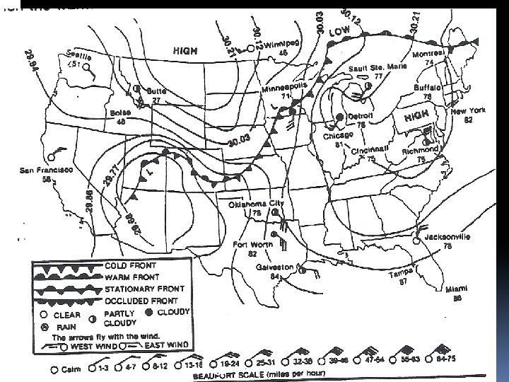 COLD FRONT A cold air mass invades a warm air mass. Cold air forces the warm air rapidly aloft along the steep front. Brings violent storms followed by fair cooler weather Cumulus COLD AIR Cumulonimbus WARM AIR The front continues moving in the direction of the cold front. Cumulus