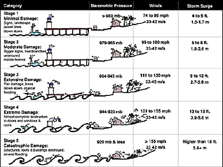 Hurricane • huge, slowly spinning tropical storm that forms over water • Winds of at least 74 MPH or more (large scale cyclone that causes great destruction to coastal areas) • Winds circulate counter-clockwise • Need warm water temp and moist conditions • Builds energy as it moves across the ocean, sucking up warm, moist tropical air from the surface and dispensing cooler air