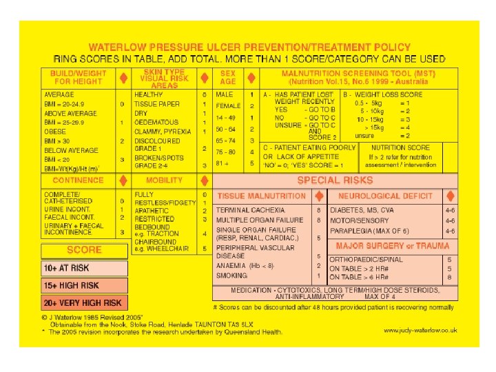 Waterlow scoring points • Intuitive scoring – higher the score, higher the risk (cf Braden for instance) Problems • Terminal cachexia • Perioperative care • Capacity and compliance of patient