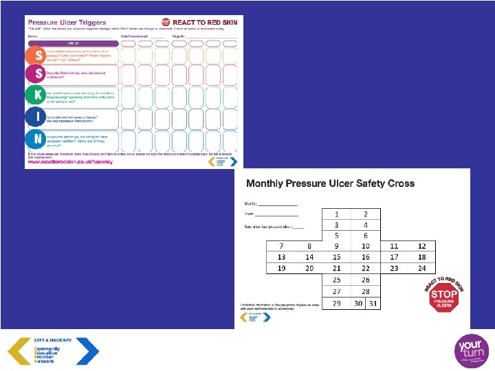 Step 4 • Keep It Going – Pressure Ulcer Prevention needs to become part of your day to day lives – Get used to using the tools to help record the work that you are doing – Publish your pressure ulcer prevention policy on your website – Keep a log of how many days ‘Pressure Ulcer Free’ you are in your area and communicate it regularly to staff using the Safety Cross – Visit the website for advice and support – www. reacttoredskin. co. uk/hackney
