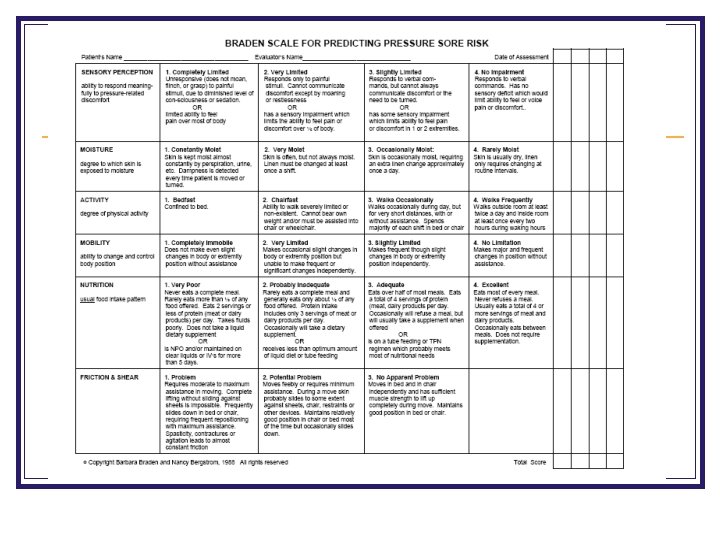 BRADEN SCALE Provides method for assessing a patient’s pressure ulcer risk by evaluating: n Sensory perception: ability to respond to pressurerelated discomfort n Moisture: degree to which skin is exposed to moisture n Activity: degree of physical activity n Mobility: ability to change and control body position n Nutrition: usual food intake n Friction and Shear