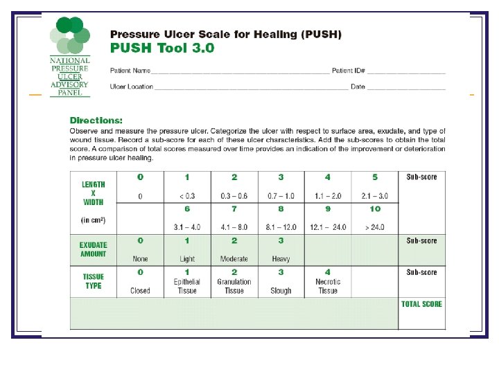 PRESSURE ULCER SCALE FOR HEALING (PUSH) n A validated method to document healing over time n Observe and measure the ulcer’s: Ø Ø Ø n Surface area: measure with centimeter ruler Exudate: estimate portion of ulcer bed covered by drainage Appearance: estimate portion of ulcer for each tissue type (epithelial, granulation, slough, necrotic) Assign weighted score to obtain total score; total scores over time indicate healing or deterioration