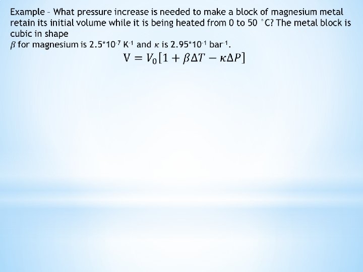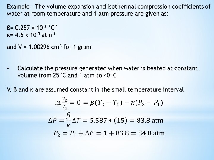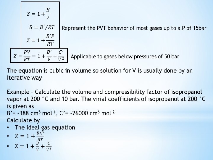The compressibility factor accurately describes the PVT behavior of gases at low to medium pressures A cubic equation of higher complexity is applied to define the PVT behavior of liquids as well as gases The equation also known as Redlich/Kwong equation has three roots at most of the low pressure range The smallest root is liquid volume, the highest vapor volume and the middle is of no significance Thus volumes of saturated liquid and saturated vapor are given by the smallest and largest roots when P is the saturation or vapor pressure The equation is solved by iteration See text book for iteration steps and calculation of the constants a and b