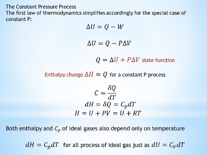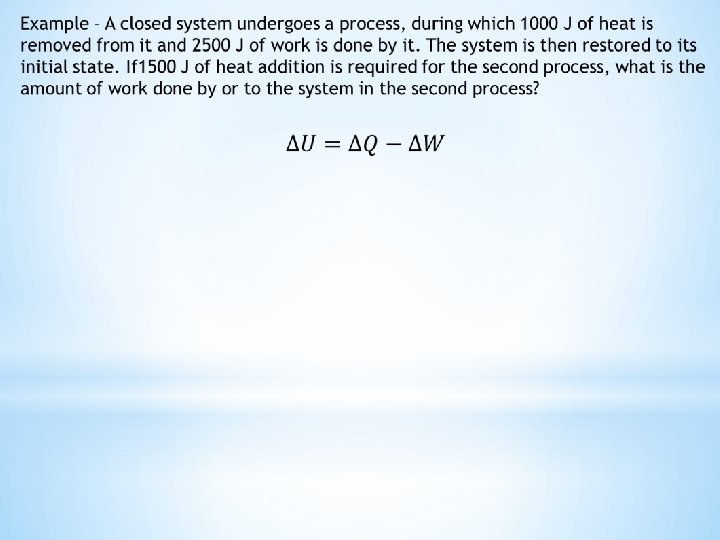 Let U be a thermodynamic state function of the system called the internal energy ΔU is the change in internal energy of the system for any process Q is the quantity of heat that flows into the system during process W is defined as the mechanical work done on the system by the external pressure W’ is defined as all other kinds of work done on the system during the process Thus Mathematical formulation of the First law of thermodynamics U is a state function and is independent of the path Q, W, and W’ are process variables that depend on the path Mechanical work is the only work done in practical applications and W’ is omitted The signs of Q and W depend on the direction of the energy transfer They are positive when heat is transferred into the system and work is done by it through expansion They are negative when heat flows out of the system and work is done on it by compression