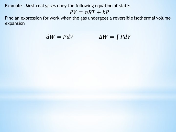 Constant a is replaced by RT with the establishment of ideal gas temperature scale where the ratio PV/RT, Z is called the compressibility factor An alternative representation of Z: B, C, D, etc called virial coefficients represent the interaction between pairs of molecules, three-body interactions, four-body interactions respectively Contributions to Z of the higher-ordered terms fall off rapidly As the pressure of a real gas is reduced at constant temperature, its volume increases and the contributions of the terms B’/V, C’/V 2 decrease As pressure of the gas approaches zero, molecular distance become infinite, molecular attractions become negligible and Z approaches unity so for 1 mole of ideal gas