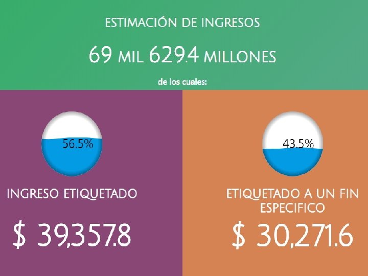 PRESUPUESTACIÓN DE INGRESOS Durante el 2019, los ingresos estimados del Gobierno del Estado ascienden a $69, 628. 4 MDP, de los cuales se desglosan en las siguientes categorías: • • • PARTICIPACIONES (36. 9%) APORTACIONES (30. 6%) TOTAL DE INGRESOS DE GÉSTION (21%) CONVENIOS (9. 3%) INCENTIVOS DERIVADOS DE LA COLABORACIÓN FISCAL (2. 2%)