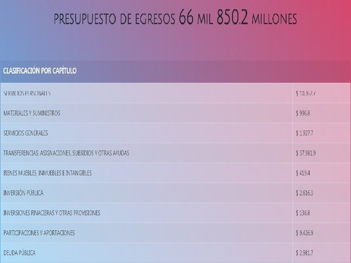 66 MIL 850. 2 MILLONES PRESUPUESTO DE EGRESOS ¿QUIÉN GASTA? CLASIFICACIÓN ADMINISTRATIVA Las Dependencias y Entidades del Poder Ejecutivo así como otros organismos autónomos como el Poder Judicial, el Congreso, Instituto Electoral, por mencionar algunos ¿EN QUÉ GASTA? CLASIFICACIÓN FUNCIONAL Agrupa los gastos según los propósitos u objetivos socioeconómicos que persigue el Estado. ¿PARA QUÉ SE GASTA? CLASIFICACIÓN ECONÓMICA Agrupa los gastos según los propósitos u objetivos socioeconómicos que persigue el Estado.