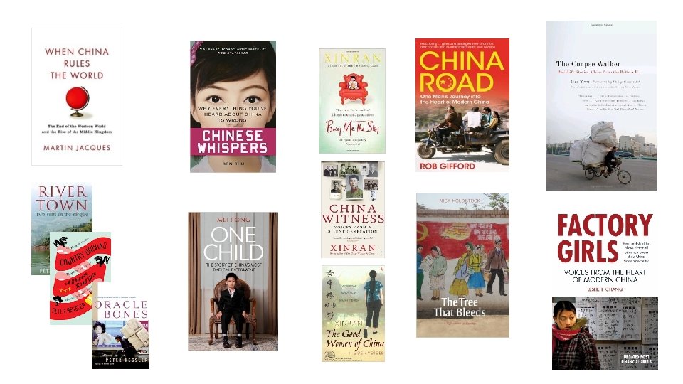 Emerging China Martin Jacques – When China Rules the World: The End of the Western World and the Rise of the Middle Kingdome [also good for Economics] Peter Hessler – River Town, Country Driving and Oracle Bones. Leslie T. Chang – Factory Girls: from Village to City in a Changing China. [migrant workers] Nick Holdstock – The Tree that Bleeds: A Uyghur Town on the Edge. [ethnic minorities]