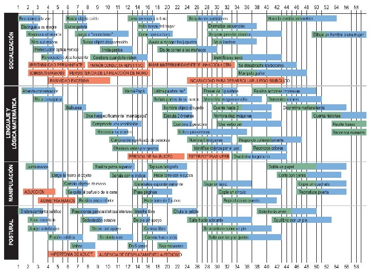 TEST HAIZEA-LLEVANT Utiliza áreas de valoración muy similares al Denver Realizado en población española Consta de 97 elementos: 26 de socialización 31 de lenguaje y lógica-matemática 19 de manipulación (motor fino) 21 de postural (motor grueso) Para la interpretación del test, se traza una línea vertical partiendo desde la edad en meses del niño y atravesando dichas áreas. Hay que valorar que realice los elementos quedan a la izquierda de la línea trazada o aquéllos que atraviesa la línea. En el caso en el que se constate la falta de adquisición de dichos elementos en una o varias áreas, así como la presencia de señales de alerta nos llevará a la sospecha de un retraso psicomotor