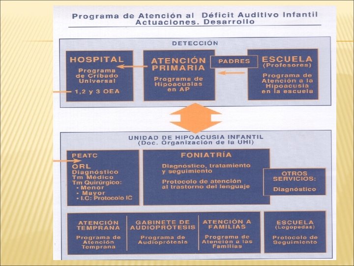 PREVENCIÓN DE SORDERA PRIMARIA -Genética. . . . Consejo genético -No genética. . Prenatales. . . Embarazo Perinatales. . Parto, neonatología Postnatales. . Vacunas No ototóxicos Tto correcto otitis , fístula Evitar ruido > a 85 d. B SECUNDARIA -Screening (con o sin factores de riesgo) neonatal -Búsqueda del caso TERCIARIA -Tratamiento –Rehabilitación precoz -Accesibilidad a prestaciones financiadas por Admon pública -Favorecer estructuración escolar adecuada