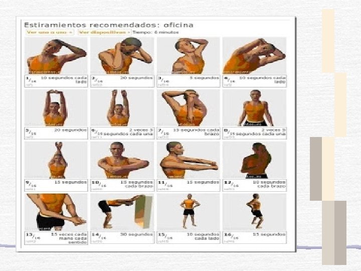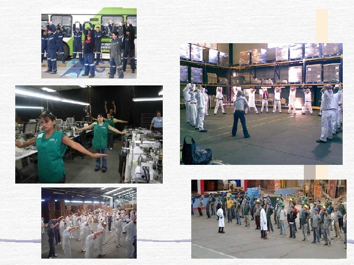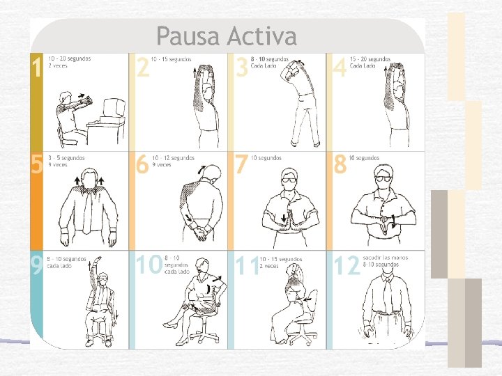 PAUSAS ACTIVAS • La pausa activa incluye un rutina de ejercicios de elongación de diferentes grupos musculares y movilidad articular. • Se realiza en un breve espacio de tiempo en la jornada laboral con el fin de activar la respiración, circulación sanguínea, energía corporal y prevenir lesiones musculares. • Debería realizarse por lo menos 2 veces al dia, durante 5 -10 minutos.