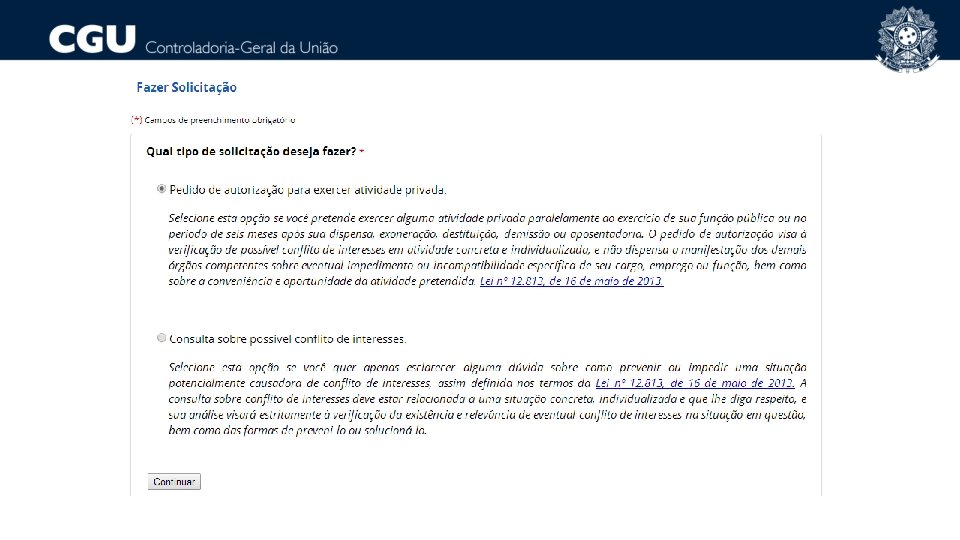 Marco normativo Lei nº 12. 813/2013 – Lei de Conflito de Interesses • Dispõe sobre o conflito de interesses no exercício de cargo ou emprego do Poder Executivo federal e impedimentos posteriores ao exercício do cargo ou emprego Portaria Interministerial MP-CGU nº 333/2013 • Disciplina a consulta sobre a existência de conflito de interesses e o pedido de autorização para o exercício de atividade privada por servidor ou empregado público do Poder Executivo federal Portaria CGU nº 1. 911/2013 • Define os procedimentos internos necessários à deliberação da CGU sobre consultas ou pedido de autorização. Orientação Normativa CGU nº 02/2014 • Dispõe sobre o exercício de atividades de magistério por agentes públicos do Poder Executivo federal Orientação Normativa Conjunta CGU-CEP nº 01/2016 • Dispõe sobre a participação de agentes públicos federais em eventos e atividades custeados por terceiros.