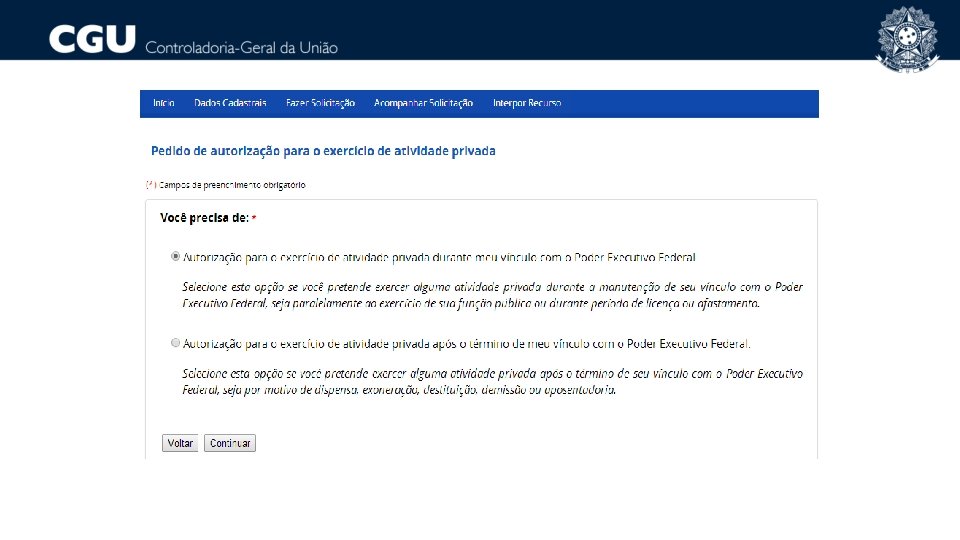 Procedimentos para Consulta ou Pedido de Autorização Registra a solicitação no Se. CI Juízo de Admissibilidade • Servidor ou Empregado Público (sistema não atende aos servidores sob competência da CEP) Órgão de Lotação faz a análise preliminar Não há potencial conflito Órgão Registra Resposta no Se. CI Prazo de resposta: 15 dias • RH responsável pelo recebimento da solicitação/envio da resposta • Órgão pode designar outra área para realizar a análise Há potencial conflito • Pode determinar medidas CGU decide para eliminação ou mitigação sobre casos de do conflito potencial conflito O interessado pode recorrer da decisão ao Secretário. Executivo da CGU Prazo de resposta CGU: 15 dias (prorrogável) Prazo de recurso Agente Público: 10 dias Prazo decisão CGU: 15 dias