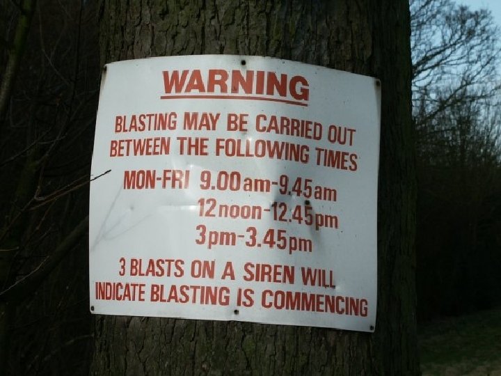 Warning Signals w Be alert and share information w Know the blasting time, blast area and clearing procedure; and w Do not enter the blast area until an “all-clear” signal is sounded.