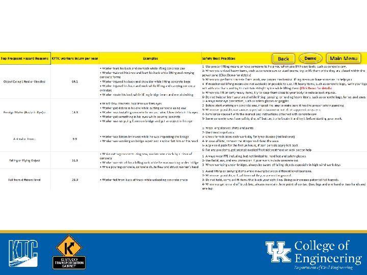 Recent Effort • Development of a Pre-Task Safety Talk Tool • Injury Data (2005 – 2015) • Total number of claims (3, 876) • Classified according to NCCI code • Information included: • Event date, time, and location • NCCI Cause description • Incident description • Claimant age, title, and other info.