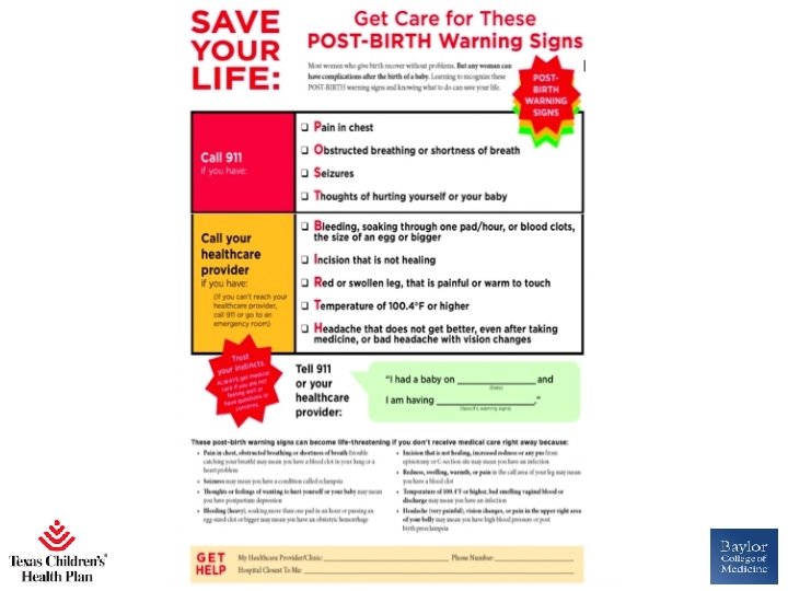 Texas Pregnancy-related Mortality • Leading underlying causes of pregnancy-related death in 2012 identified by the Task Force were: 1. 2. 3. 4. 5. cardiovascular and coronary conditions obstetric hemorrhage infection/sepsis cardiomyopathy preeclampsia/eclampsia, mental health conditions, and amniotic fluid embolus https: //www. dshs. texas. gov/mch/maternal_mortality_and_morbidity. shtm