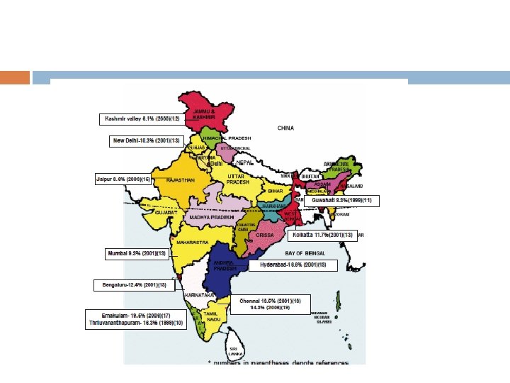 Coronary artery diseases State reports a higher prevalence of coronary artery diseases when compared to other states in India 7. 4% in rural (in 1991) � 13. 5% in urban(in 1995) � The estimated prevalence of coronary artery disease in the age group 20 -69 years for 2015 is 10. 1 %. (31) *Kutty VR, Balakrishnan KG, Jayasree AK, Thomas J. Prevalence of coronary heart disease in the rural population of Thiruvananthapuram district, Kerala, India. Int J Cardiol [Internet]. 1993 Apr [cited 2015 Apr 24]; 39(1): 59– 70. Available from: http: //www. ncbi. nlm. nih. gov/pubmed/8407009 **Begom R, Singh RB. Prevalence of coronary artery disease and its risk factors in the urban population of South and North India. Acta Cardiol [Internet]. 1995 Jan [cited 2015 May 7]; 50(3): 227– 40. Available from: http: //www. ncbi. nlm. nih. gov/pubmed/7676762 ***National Commission on Macroeconomics and Health. NCMH Background Papers·Burden of Disease in India. New delhi; 2005. p. 1 – 388. Available from: http: //www. who. int/macrohealth/action/NCMH_Burden of disease_(29 Sep 2005). pdf