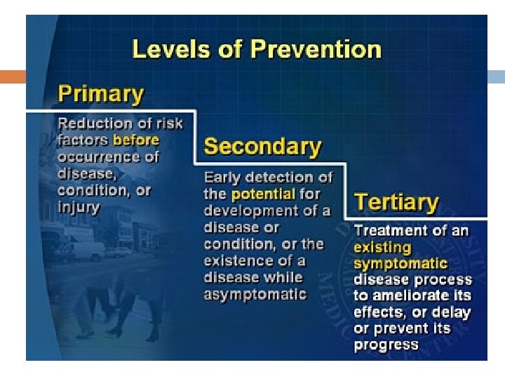 Secondary and tertiary prevention Primodial prevention Primary prevention