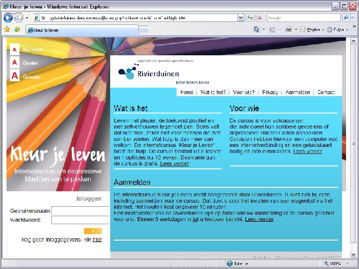 E-health and prevention Ø Ø Ø Ø Cursus of e-mailcoaching via internet: www. alcoholondercontrole. nl www. boulimiadebaas. nl www. cannabisondercontrole. nl www. drugsondercontrole. nl www. eetbuienondercontrole. nl www. familievan. nl www. gokkenondercontrole. nl www. gripopjedip. nl www. internetondercontrole. nl www. kleurjeleven. nl www. rokenondercontrole. nl Behandeling via internet is mogelijk via www. interapy. nl. Daarnaast bieden verschillende GGZ-instellingen die participeren in Indigo ook online behandelaanbod, zoals: www. mijnparnassia. nl