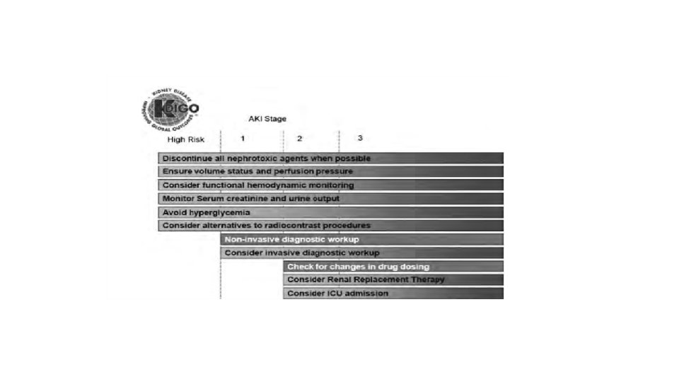Role for the Intensivist to prevent kidney injury When do you get consulted? EGDT Normal Increased risk Optimize RRT Defend Blood Pressure Restore & Optimize Perfusion Use inotropes with care Mitigate Inflammatory Injury Damage Timing, Dose Drug dosing GFR Kidney failure Antecedents Intermediate Stage AKI Outcomes Death