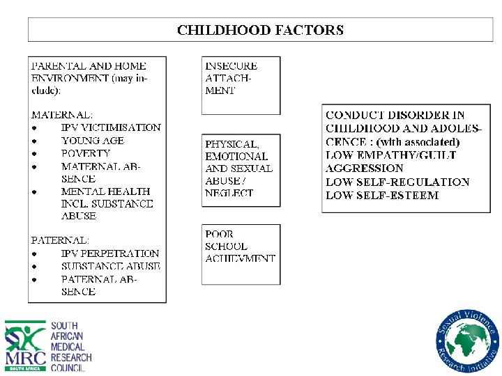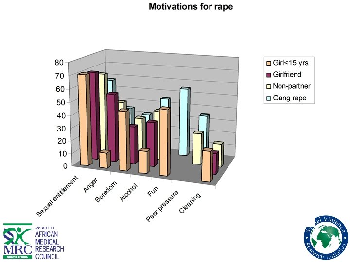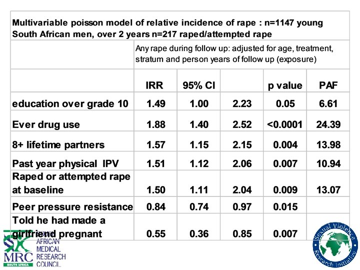 Rape prevention: interpreting research findings, understanding context • Local knowledge is essential – Understand the context in which rape occurs – Understand confounding • Need theoretical models that draw on understandings from a range of disciplines • Rape prevention has to include addressing the context in which rape is often perpetrated (social or environmental) as well as addressing distal factors