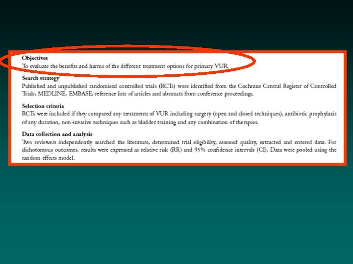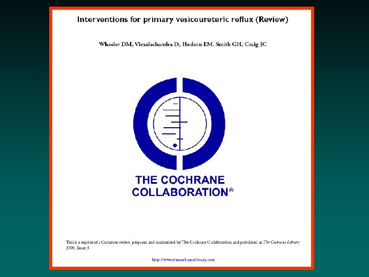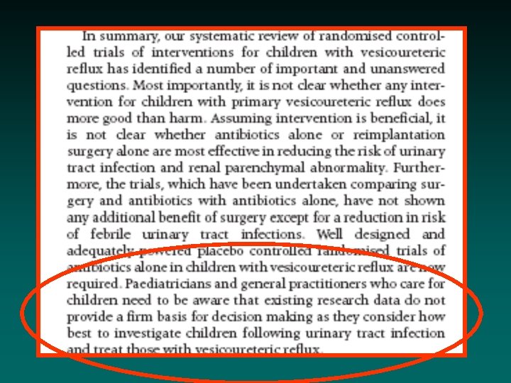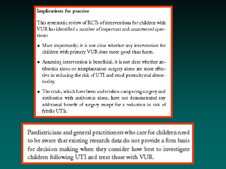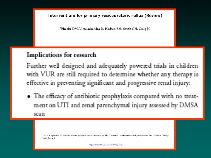 Our questions: antibiotics, yes or no, which, and when? § Medical vs surgical therapy? § Not clear! § Meta–analysis (Wheeler, et al, Arch Dis Child 2003; 88: 688 -594): found 7 randomized, controlled studies, ABP vs surgery, n = 859 § 4 studies: no difference after 5 years § 2 studies: less febrile UTI, at 5 years, surgery (10%) vs ABP (22%) §But no difference in scarring!