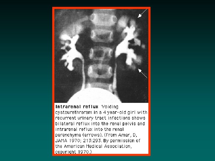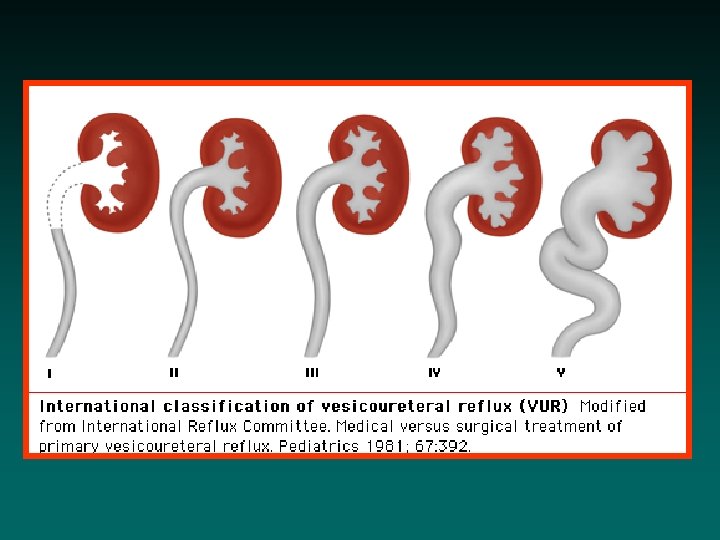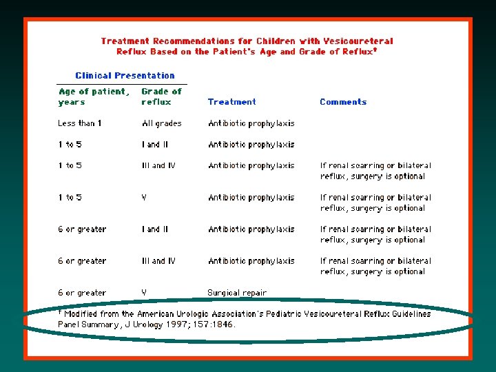 Principles of management § Premise: VUR can cause upper UTI by bringing bacteria to the kidneys § Results: renal scarring, loss of parenchyma reflux nephropathy: § Potential for hypertension, decreased renal function, proteinuria, renal failure/ end stage renal disease § Management: based on § Identification of kids with VUR § Prevention of renal damage due to reflux