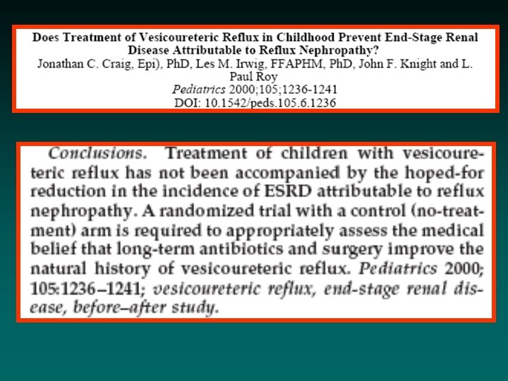 Meta-analysis, continued § 4 studies: no differences in scarring after 5 years § 5% overall risk of new scars by DMSA § 4 studies: no differences in renal growth § 2 studies: no difference in hypertension or end-stage renal disease § Lack of information about surgical vs medical adverse events!!