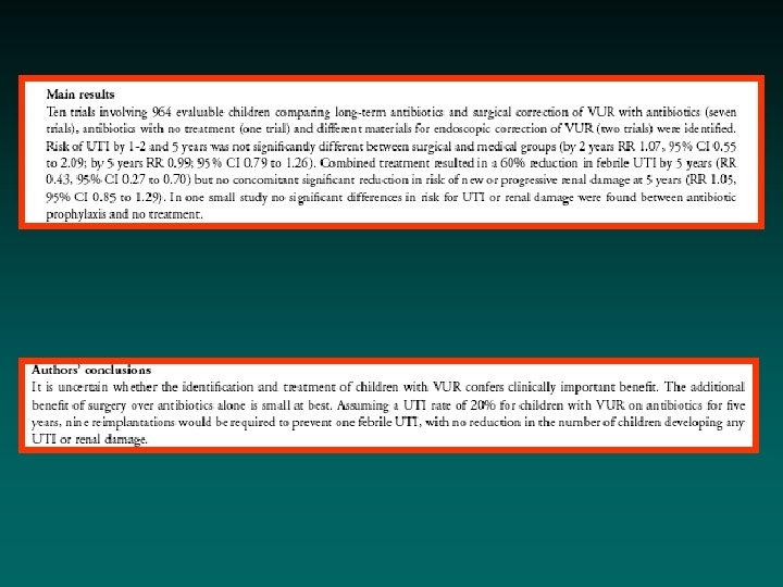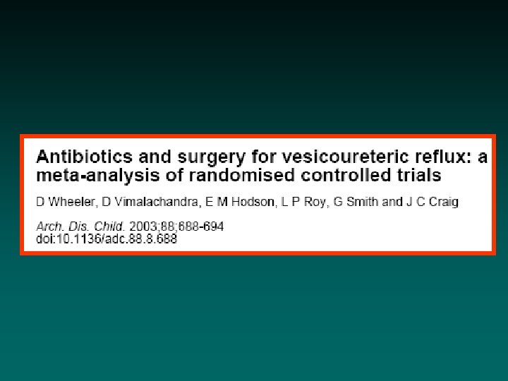Our questions: antibiotics, yes or no, which, and when? § Medical vs surgical therapy? § Not clear! § Meta–analysis (Wheeler, et al, Arch Dis Child 2003; 88: 688 -594): found 7 randomized, controlled studies, ABP vs surgery, n = 859 § 4 studies: no difference after 5 years § 2 studies: less febrile UTI, at 5 years, surgery (10%) vs ABP (22%) §But no difference in scarring!