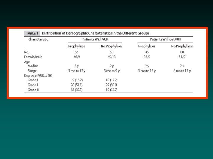 The study § Randomized, controlled study § N= 236 children, 3 months – 18 years § APN = acute pyelonephritis: pyuria, fever, positive culture (>105) + DMSA confirmation § All tested for VUR by VCUG 2 groups: § 113 VUR grades I-III and 115 no VUR § After initial treatment for APN, both groups randomized: +/- antibiotic prophylaxis (ABP)