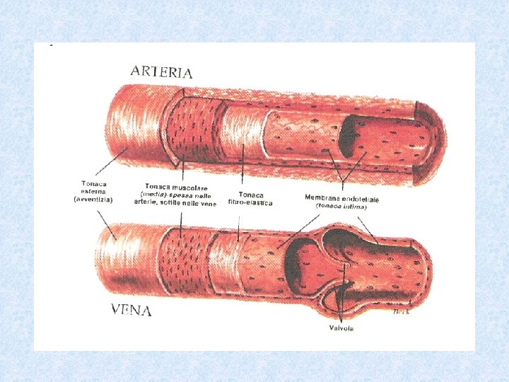 I vasi sanguigni Le arterie sono vasi preposti al trasporto del sangue pompato dal ventricolo sinistro con una pressione che normalmente varia da 80 a 120 mm. Hg. La struttura delle arterie è costituita da strati concentrici di tessuti diversi atti a contenere tale pressione e a sopportare eventuali aumenti della stessa. Lo strato interno, l’endotelio, ha lo scopo di rivestimento protettivo; segue uno strato intermedio, ricco di tessuto elastico e muscolare che ha lo scopo di conferire elasticità, e quindi lo strato più esterno, l’avventizia, costituito da tessuto connettivo che ha principalmente scopo contenitivo. Le vene sono vasi che hanno una struttura simile a quella delle arterie ma con preponderanza di tessuto di tipo connettivo piuttosto che di tipo muscolare, quindi meno elastiche. Per facilitare il ritorno del sangue al cuore, all’interno delle vene vi sono piccole valvole a forma di coda di rondine che evitano il reflusso del sangue stesso. I capillari sono sottili canali che mettono in comunicazione le arterie con le vene. La loro struttura ( sono costituiti da un unico strato di cellule endoteliali) è determinata dal fatto che svolgono la funzione di distribuire l’ossigeno e le sostanze nutritizie ai tessuti e di raccogliere i prodotti di scarto del metabolismo dei tessuti, come l’anidride carbonica.