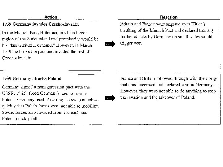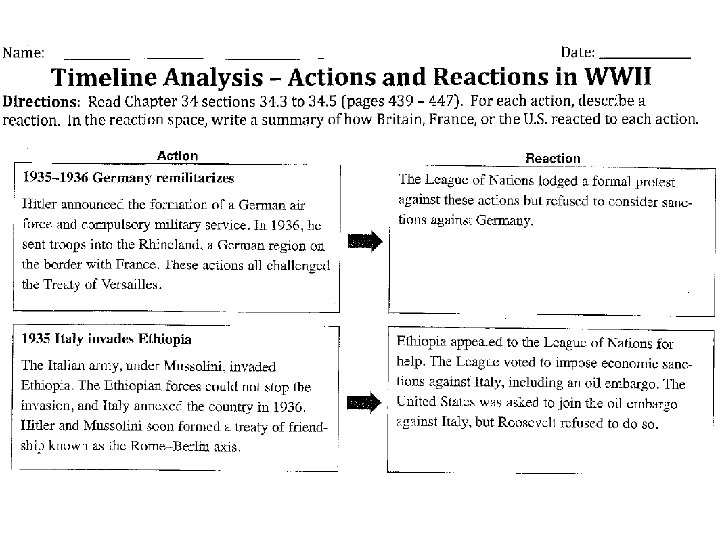 Guided Reading Notes 34. 3 to 34. 5 As you read Sections 34 to 35, write a brief summary of the action and the reaction by Britain, France or the U. S. Action 1935 -1936 Germany rebuilds its military • • • Reaction The League of Nations …