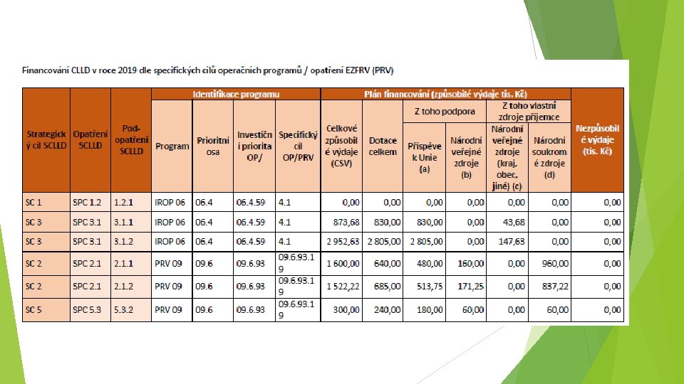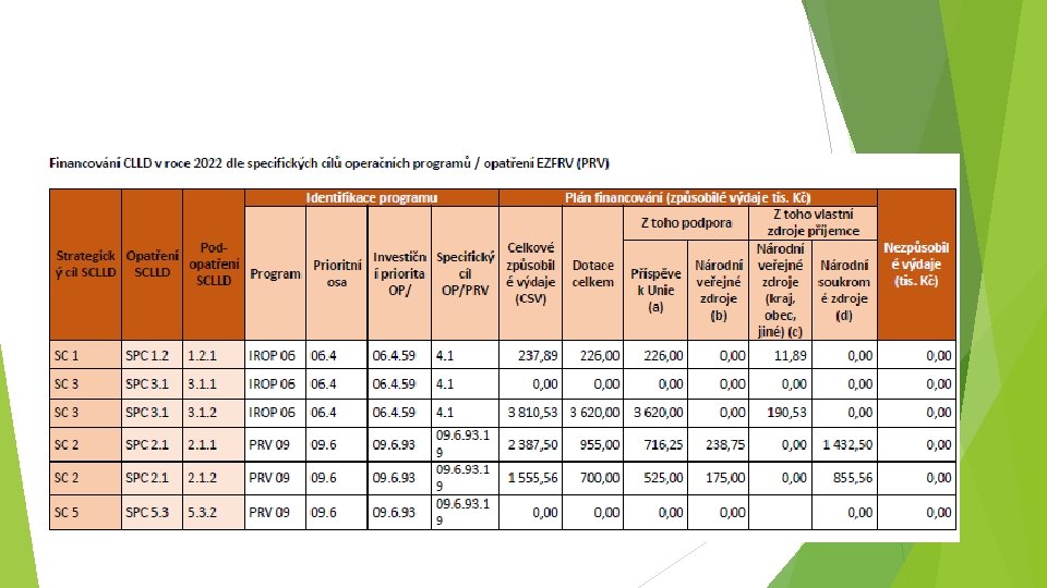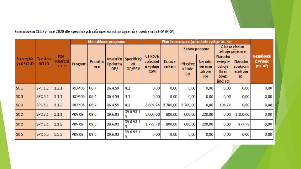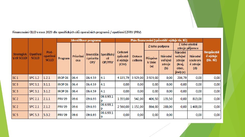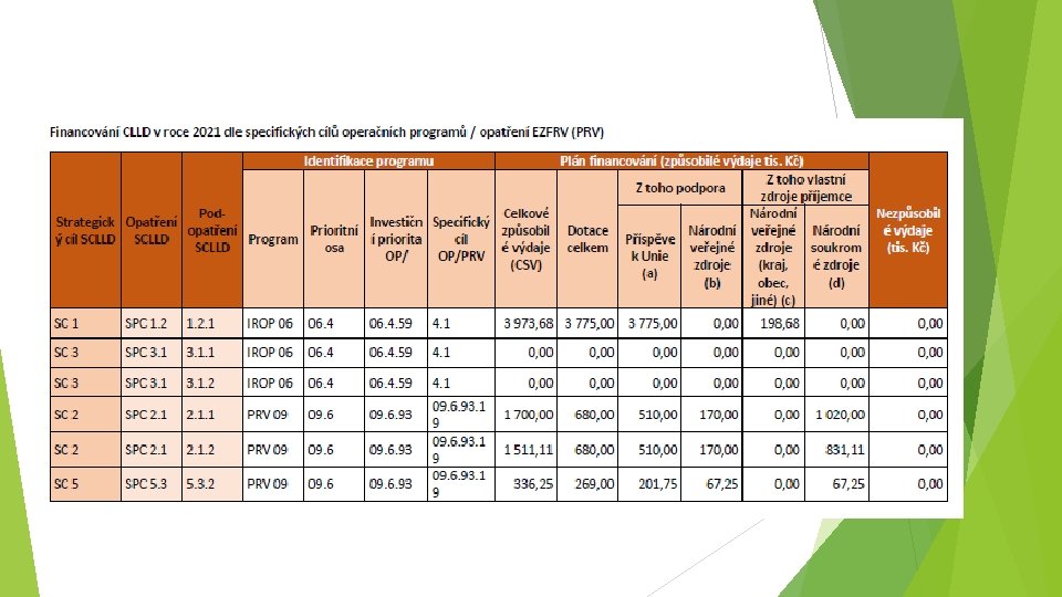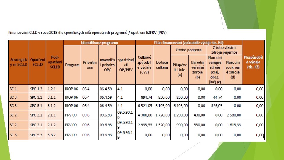 Financování SCLLD dle programů a ESIF fondů Fond Program IROP EFRR OPŽP EZFRV PRV ESF OPZ Celkem Národní spolufinancování Příspěvek Unie Podpora (tis. Kč) 25928 0 0 0 8387 2796 11183 0 0 0 34315 2796 37111