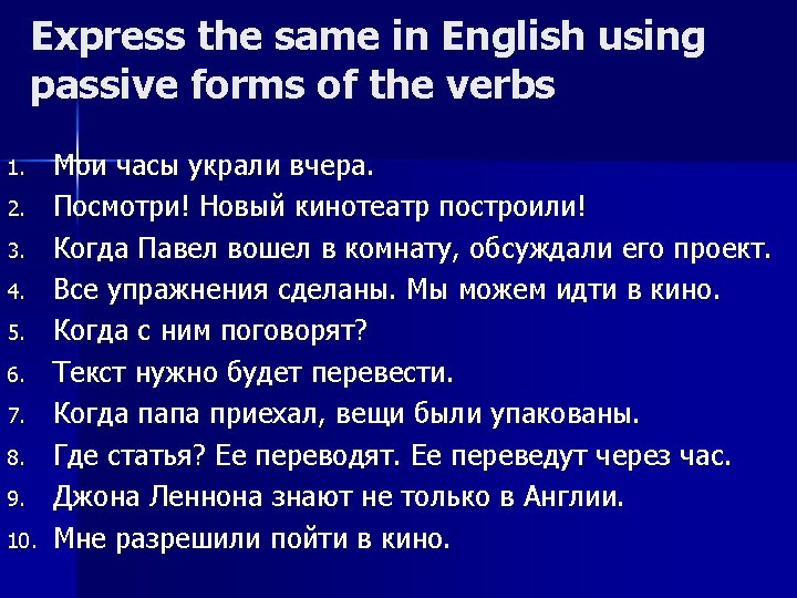 Rewrite these sentences using Passive voice: 1. 2. 3. 4. 5. 6. 7. 8. People don`t use this road very often. Somebody is using the comp at the moment. They have built a new hospital near the airport. They cancelled all flights because of fog. Somebody was cleaning the room when I arrived. The car was 3 years old but no one had used it very much. Somebody will translate this article tomorrow. By the end of the week Nick will have finished his report.