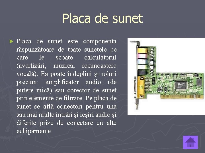 Placa de sunet ► Placa de sunet este componenta răspunzătoare de toate sunetele pe care le scoate calculatorul (avertizări, muzică, recunoaştere vocală). Ea poate îndeplini şi roluri precum: amplificator audio (de putere mică) sau corector de sunet prin elemente de filtrare. Pe placa de sunet se află conectori pentru una sau mai multe intrări şi ieşiri audio şi diferite prize de conectare cu alte echipamente.