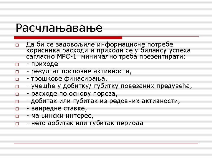 Rashodi Prihodi 1. Tekući troškovi po vrstama 1. Korekcija vrednosti zaliha 1. 1. Troškovi amortizacije nedovršene proizvodnje i 1. 2. Troškovi materijala gotovih proizvoda na kraju 1. 3. Troškovi zarada perioda: 1. 4. Troškovi proizvodnih a) povećanje (+) b) smanjenje (-) usluga 1. 5. Troškovi neproizvodnih usluga 2. Nabavna vrednost prodate 2. Prihodi od prodaje gotovih robe i materijala proizvoda, usluga, robe i materijala. 3. Finansijski rashodi 3. Finansijski prihodi 4. Vanredni rashodi 4 Vanredni prihodi 5. Dobitak 5. Gubitak