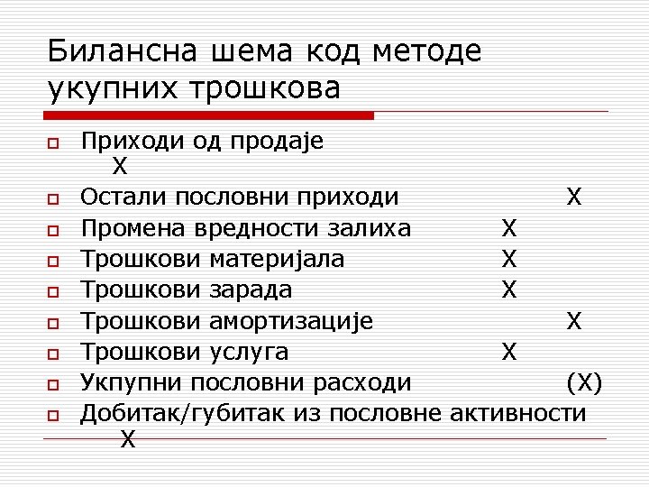 МЕТОDЕ BILANSIRANJA PERIODIČNOG REZULTATA METODA UKUPNIH TROŠKOVA METODA TROŠKOVA PRODATIH UČINAKA Navedene metode međusobno se razlikuju po strukturi i visini prihoda i rashoda perioda. Metoda troškova prodatih učinaka u prvi plan stavlja prihode ostvarene prodajom učinaka i povezuje ih sa njima pripadajućim rashodima. Metoda ukupnih troškova u prvi plan ističe troškove nastale u obračunskom periodu i povezuje ih sa njima pripadajućim prihodima. Prema tome, razlika između ove dve metode je u načinu utvrđivanja redovnog poslovnog rezultata (rezultata redovnih prihoda i redovnih rashoda). Načini utvrđivanja rezultata finansijsih rashoda i prihoda, kao i ostalih i revalorizacionih rashoda i prihoda se ne razlikuju.